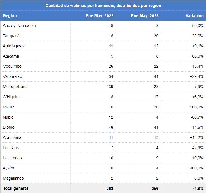 En el desglose, la región de Aysén es la que tiene peores cifras, ya que pasó de no registrar homicidios a cuatro en lo que va de año.