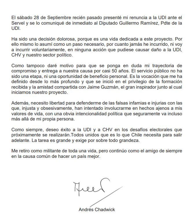 A través de una declaración pública, uno de los llamados coroneles de la UDI confirmó que dejó la colectividad el pasado 28 de septiembre para, según sus propias palabras, tener la libertad de defenderse de las "falsas infamias e injurias" en su contra, y evitar ocasionar daños en el gremialismo.