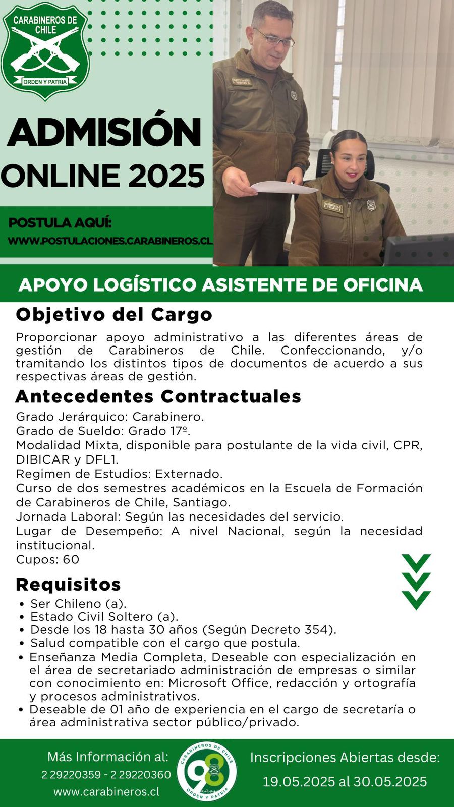 Si tu interés en ser parte de Carabineros de Chile desde la labor administrativa, este llamado a curso en línea es para ti; porque Carabineros de Chile está llamando, a través de la postulación en Línea, postulaciones.carabineros.cl, al curso de Apoyo Logístico Asistente de Oficina, desde este 19 de mayo hasta el 30 de mayo, con 60 cupos a nivel nacional.