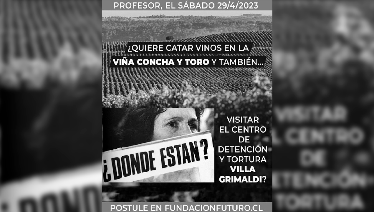 "¿Quiere catar vinos en la Viña Concha y Toro y también… visitar el centro de detención y tortura Villa Grimaldi? Postule en fundacionfuturo.cl", proponía el afiche principal de la invitación realizada por Fundación Futuro, ligada a la Familia Piñera, además de contener una imagen en blanco y negro con el rostro de una detenida desaparecida con el texto "¿Dónde están?".