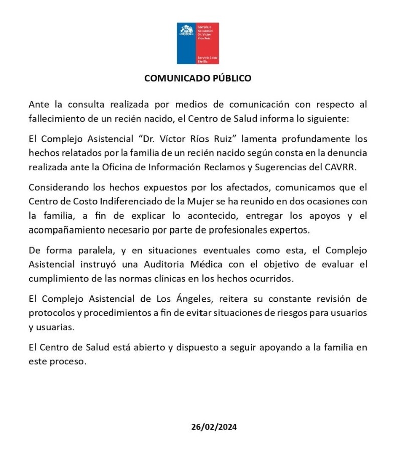 Desde el Hospital de Los Ángeles, emitieron un comunicado en donde señalan que "el Complejo Asistencial “Dr. Víctor Ríos Ruiz” lamenta profundamente los hechos relatados por la familia de un recién nacido según consta en la denuncia realizada ante la Oficina de Información Reclamos y Sugerencias del CAVRR."