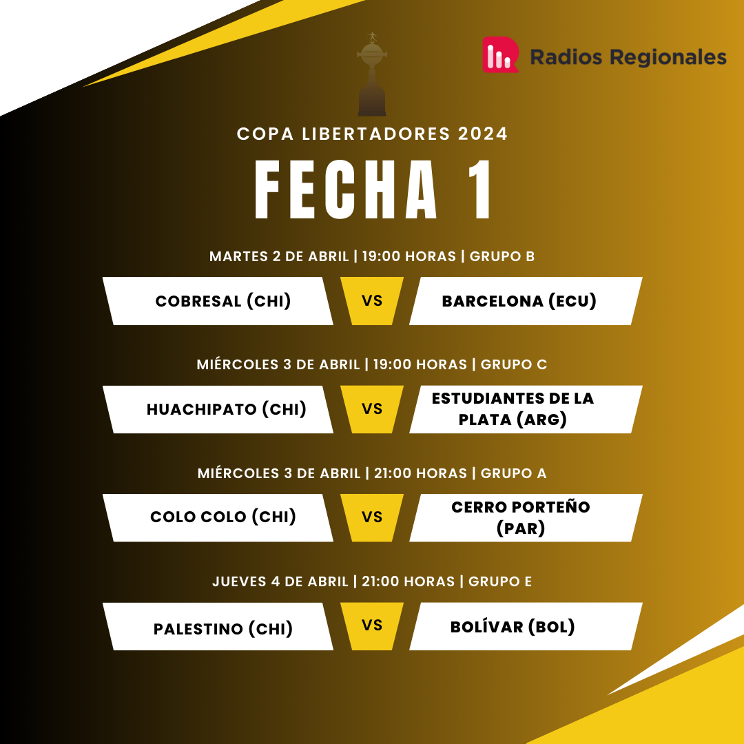 El primer equipo en representar a Chile en el certamen será Cobresal, escuadra que recibe este martes 2 de abril en Calama, al Barcelona de Ecuador. Posterior a dicho encuentro, el miércoles 3, será el turno de Huachipato y Colo Colo.