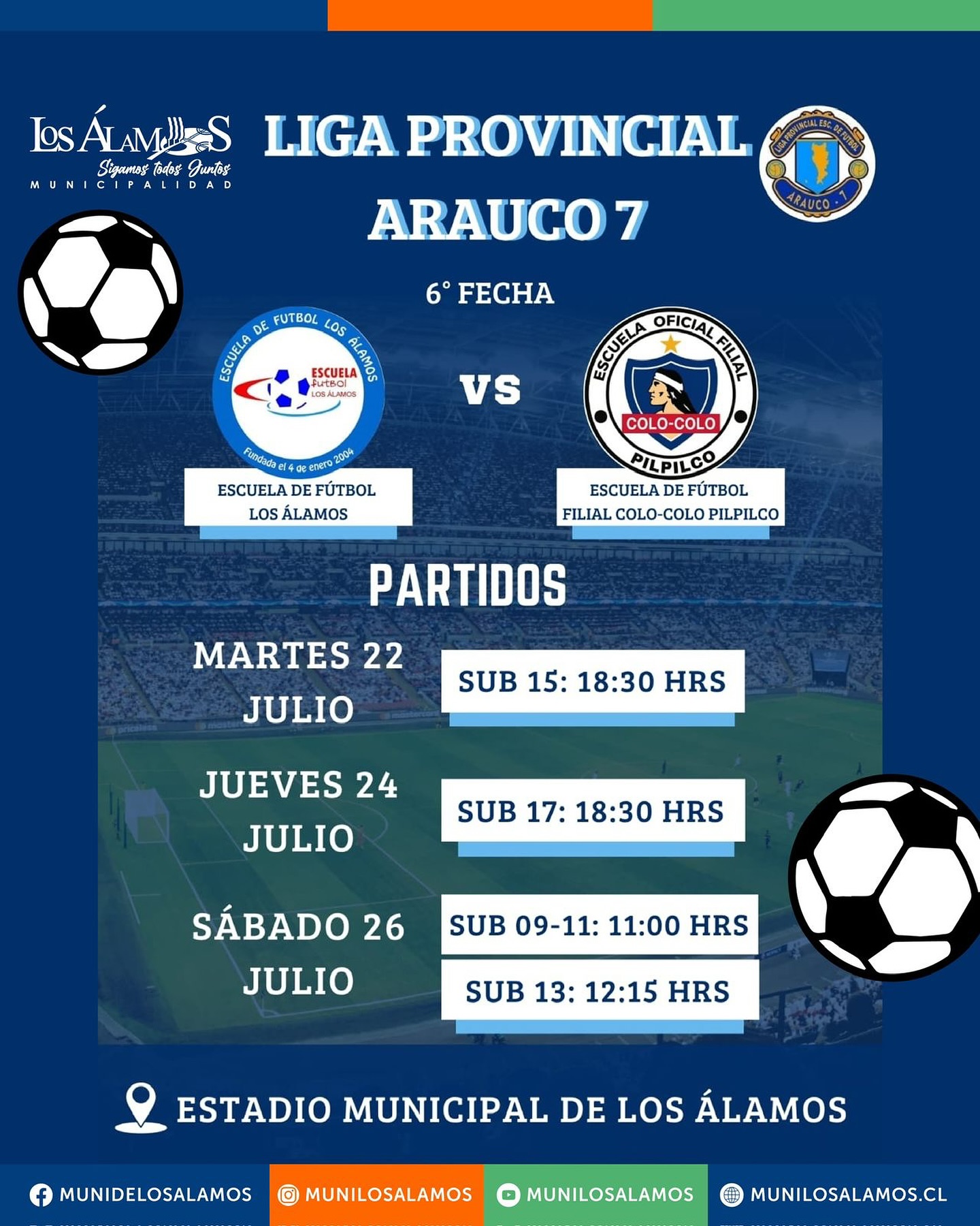 Con entusiasmo y espíritu deportivo, la Escuela de Fútbol Los Álamos se prepara para enfrentar a la Escuela Filial Colo-Colo Pilpilco en el marco de la 6ª fecha de la Liga Provincial Arauco 7. La serie de encuentros se desarrollará en el Estadio Municipal de Los Álamos y reunirá a jóvenes talentos del fútbol formativo de la provincia.