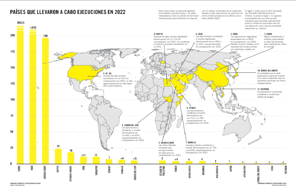 En el primer lugar se encuentra China, cuyas cifras se desconocen debido por sus políticas de secretismo. Al gigante asiático lo sigue Irán con 576 ejecuciones, en tercer lugar Arabia Saudita con 196, Egipto en la cuarta posición con 24 y EE.UU. en el quinto lugar con 18 ejecuciones.